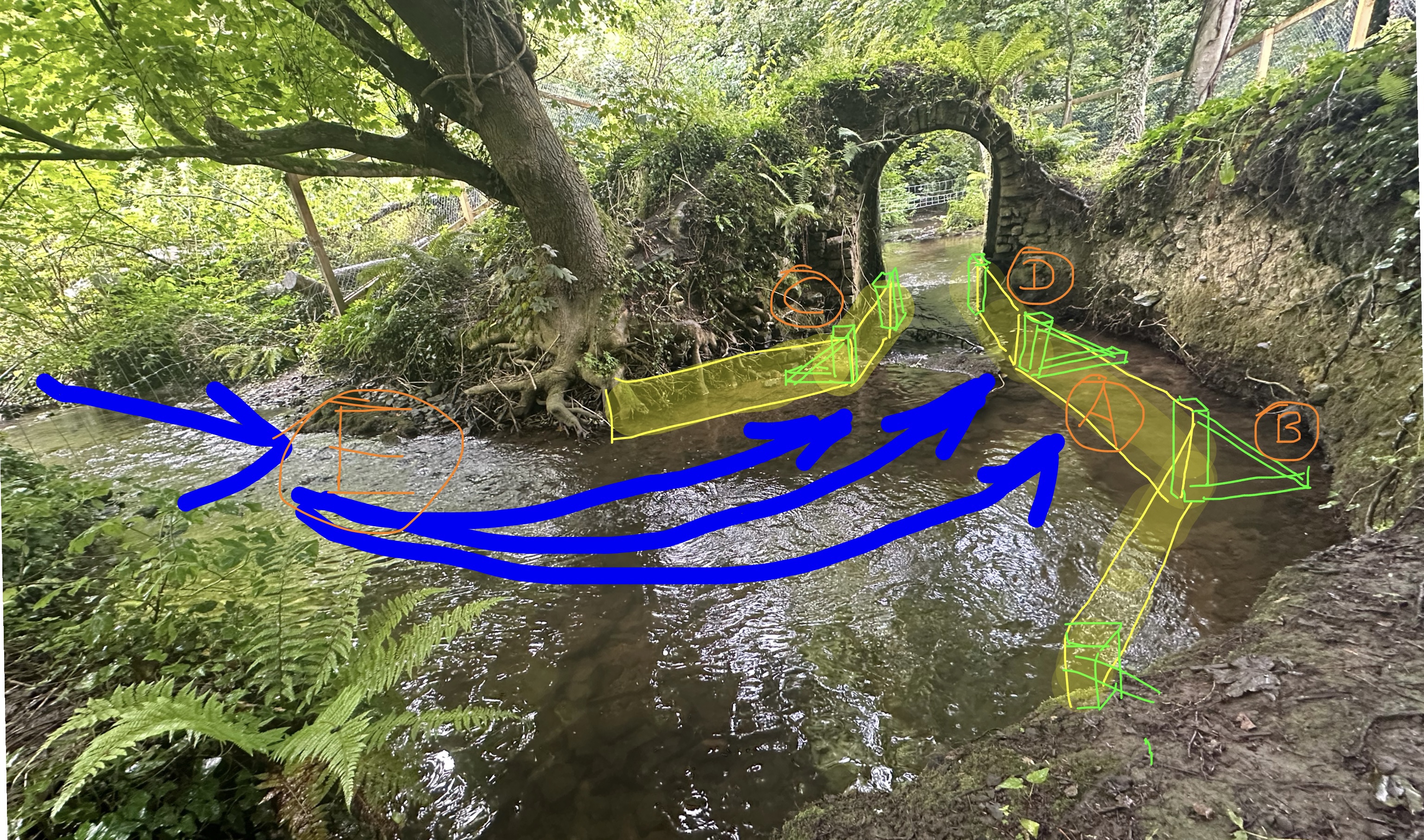 A) Suggested low tech diversion system taking the force off the structure but still allowing water to pass. Simple materials like the timber used in the fencing and faced with shuttering ply will do. It only need be temporary. A barrier height of approx 600mm should be enough.