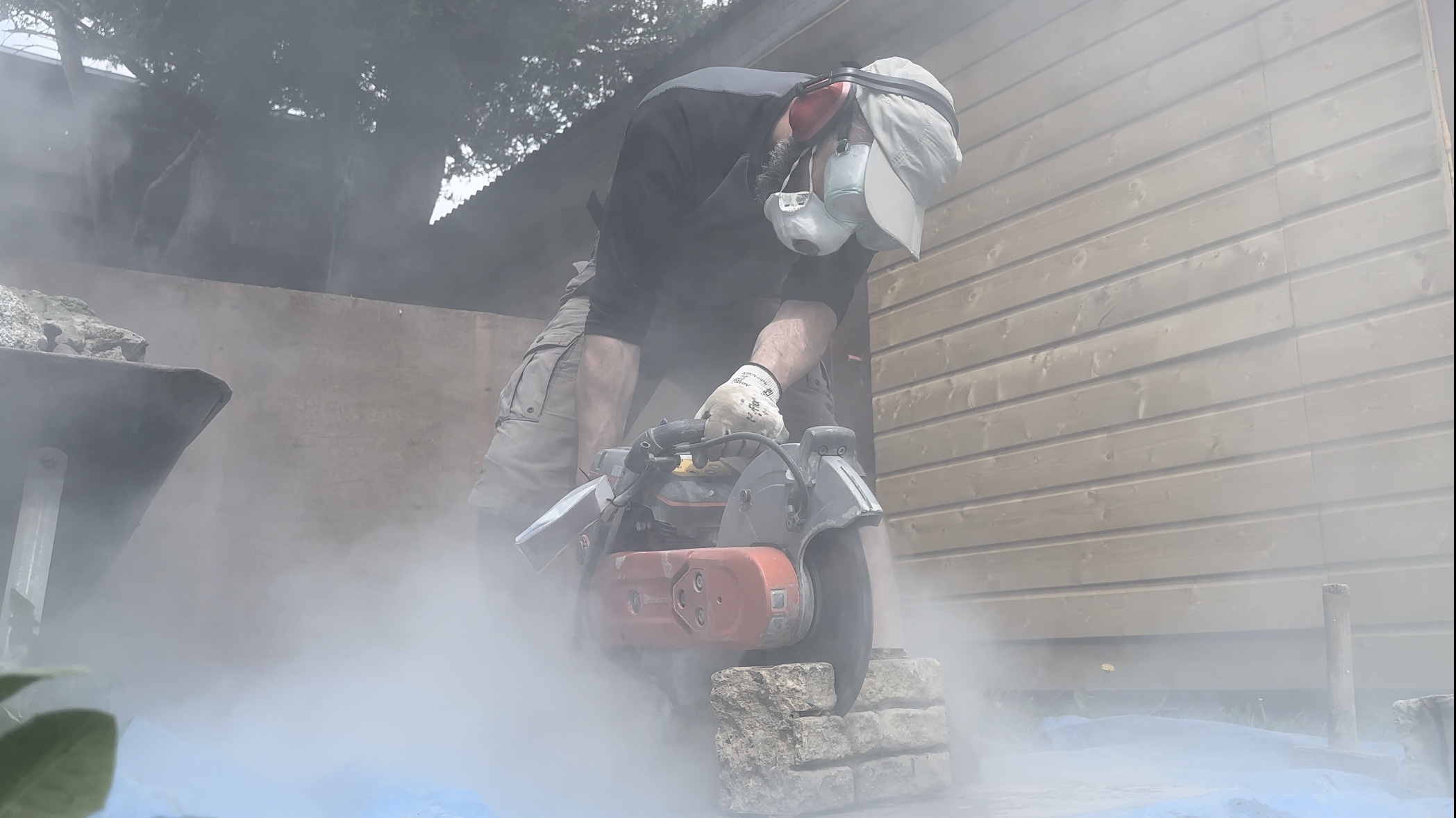 Concrete saw in hand, it’s time to begin Prototype 2. For this one, I removed the grass sod around the footprint marked with the canes from Prototype 1. I allowed generous wiggle room, adding about 50mm (2 inches) to the area of grass removed all around. Prototype 2 is an evolution of Prototype 1; it’s essentially the same, but now all the pieces have been cut and fitted in their places.